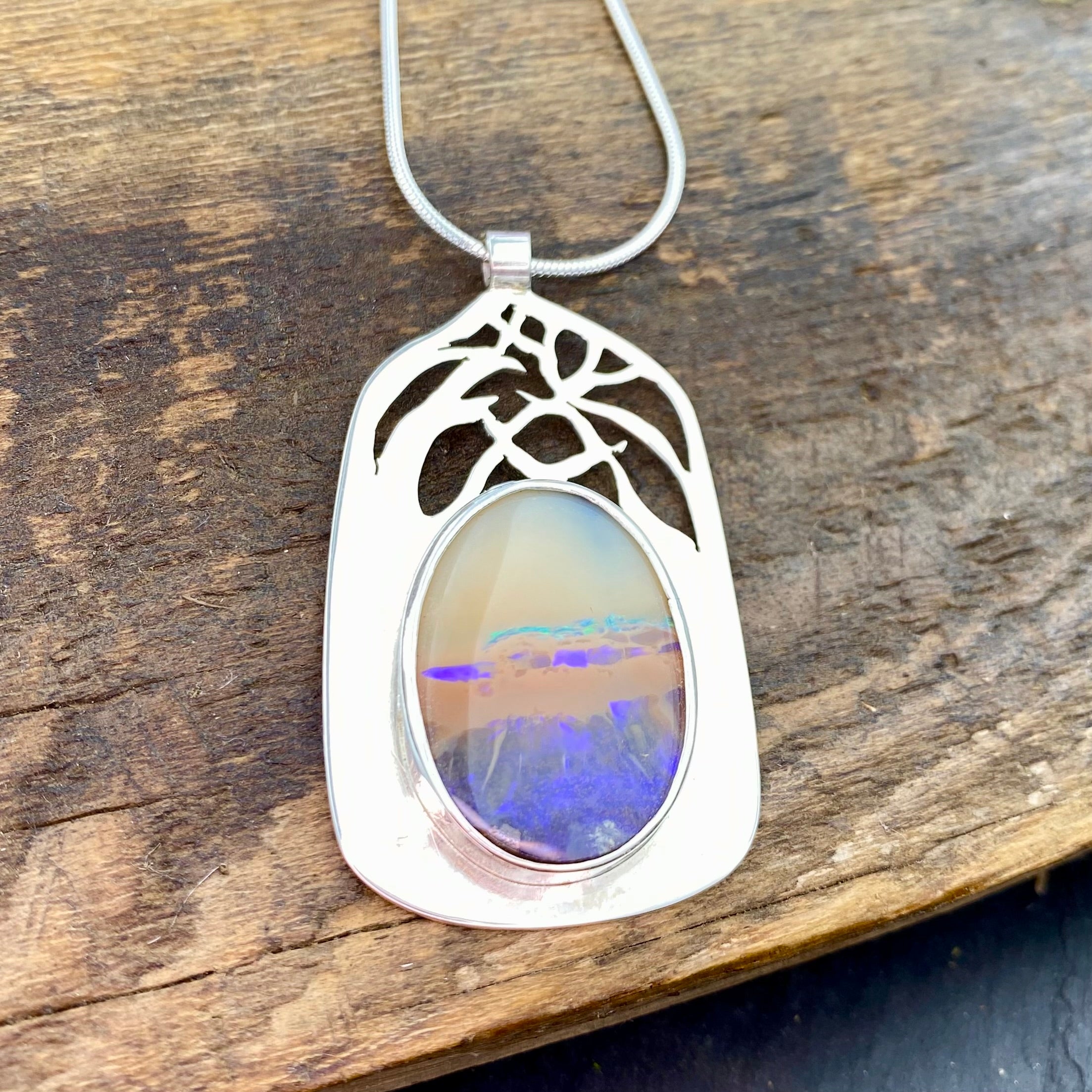 Hand forged in Sterling silver, This misty purple opal set amongst a hand pierced tree canopy and is filled with all colours and vibrant tones~ This piece is Handcrafted with Precision and love, sterling and fine silver.