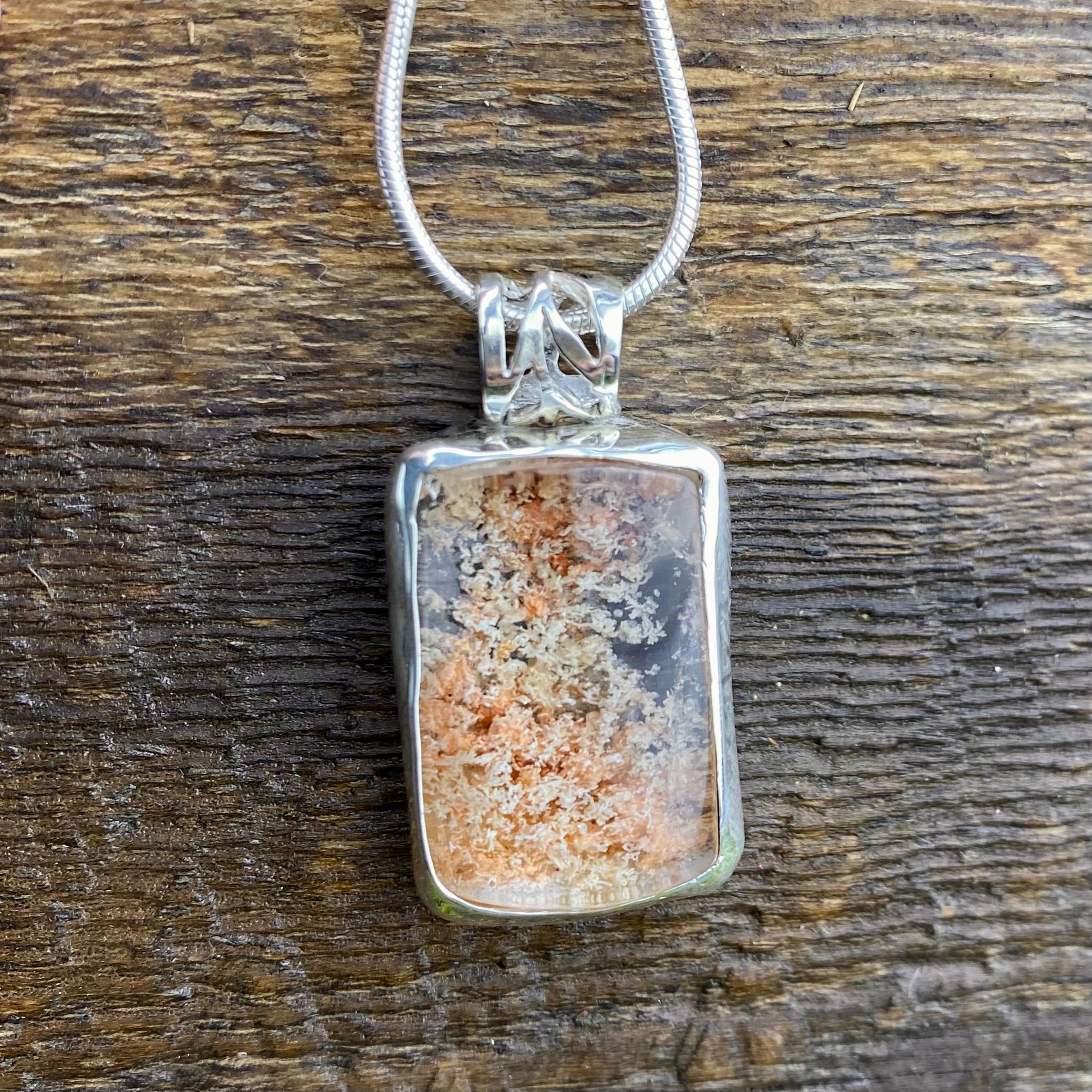 This is a really light and beautiful piece of Lodalite. This setting is detailed with gentle flow emerging from the stone. One of our newest designs, this is a truly one of a kind pendant! can be worn for all occasions, even for a walk in the woods !