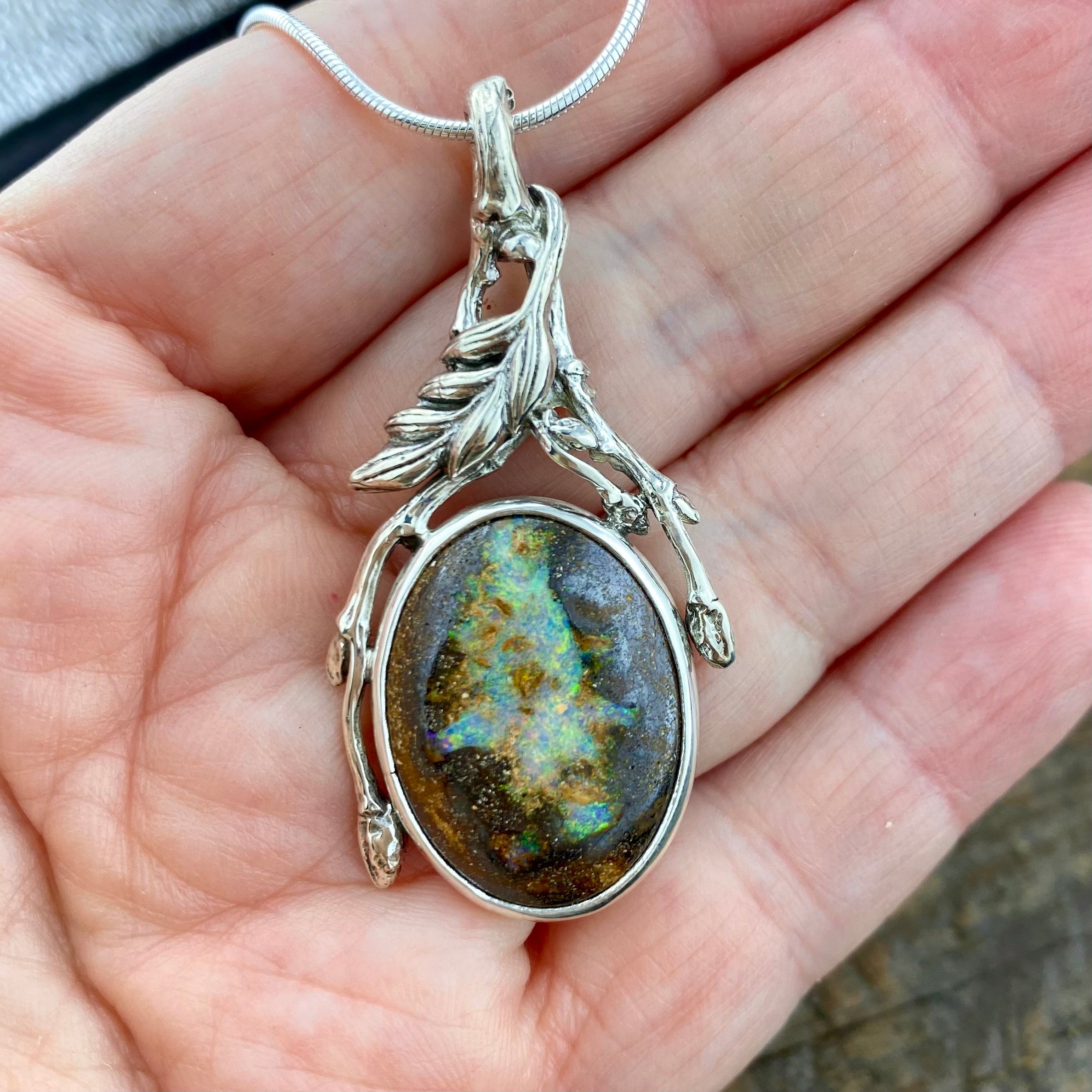 Hand forged in Sterling. This vibrant opal set amongst dancing branch flow is filled with all colours and vibrant tones~ This piece is Handcrafted with Precision and love with sterling and fine silver.