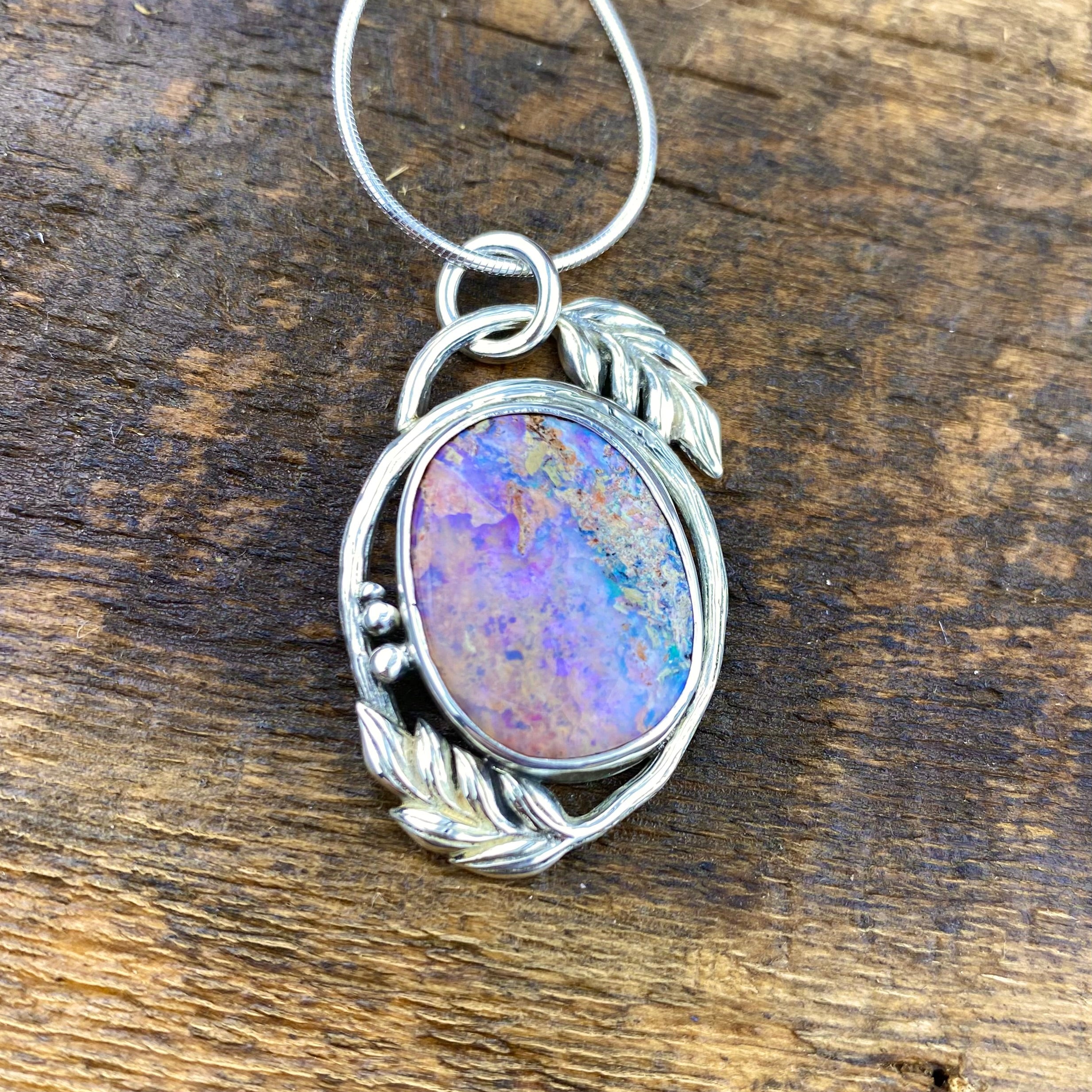 Hand forged in Sterling silver, This vibrant purple opal set amongst sculpted flow is filled with all colours and vibrant tones~ This piece is Handcrafted with Precision and love, sterling and fine silver.