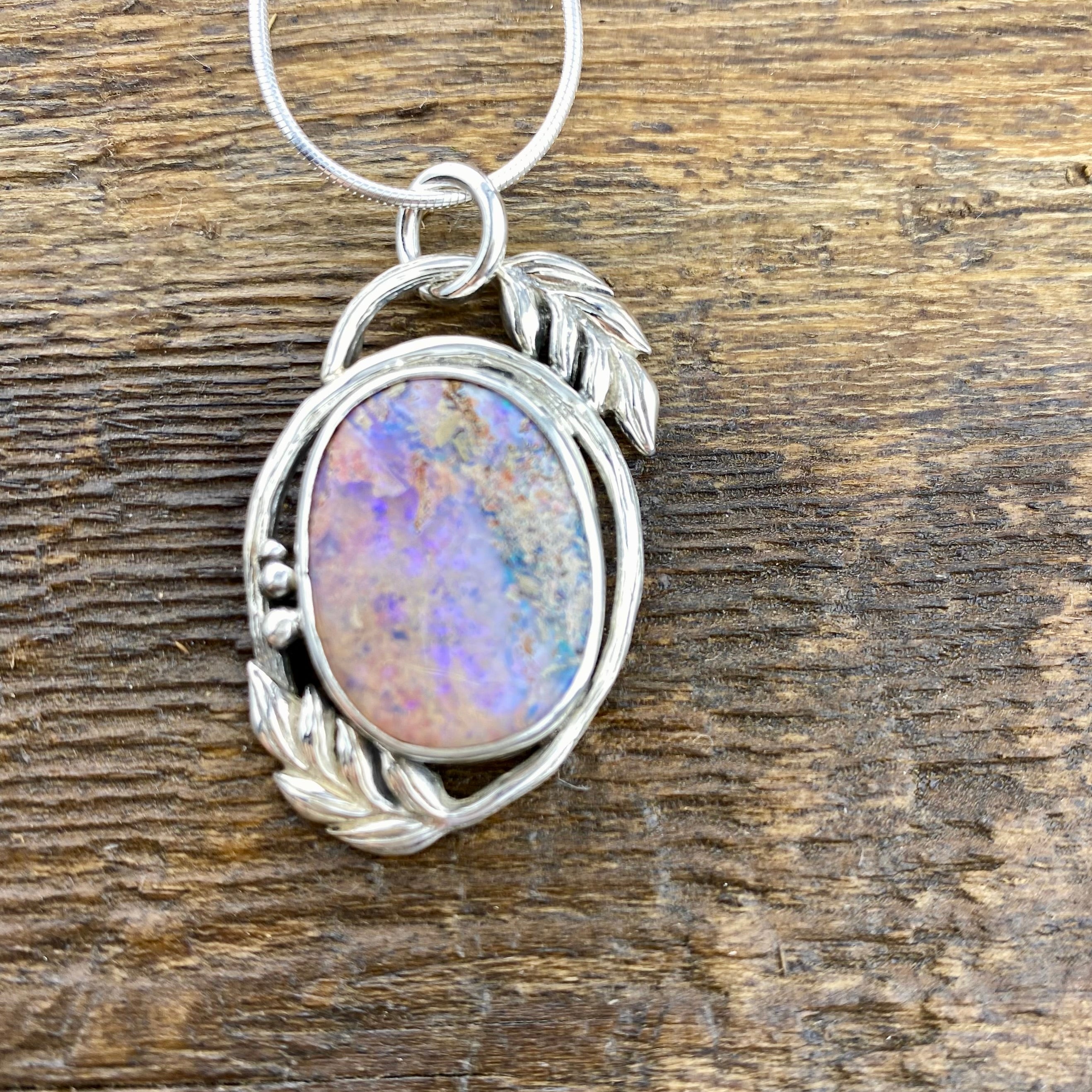 This gorgeous one a kind piece features such a Lovely piece of Purple Pipe Boulder Opal, full of light ethereal sparkle and colour!