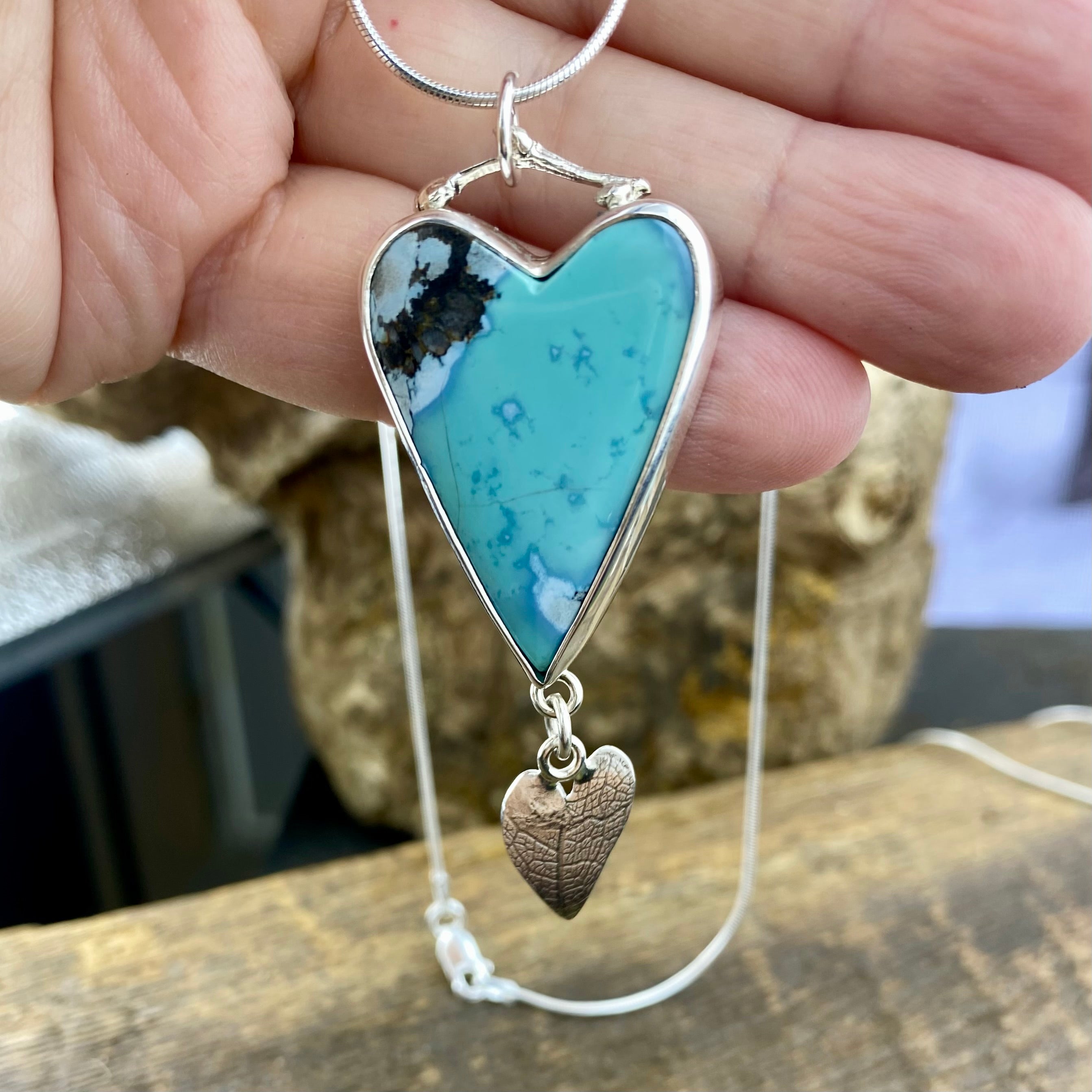 This is a really bright and beautiful piece of Turquoise.. A Beautiful bright toneTurquoise with light veins throughout. Set with a sweet heart droplet with leaf detail, this comfy grounding and powerful pendant can be worn for all occasions!