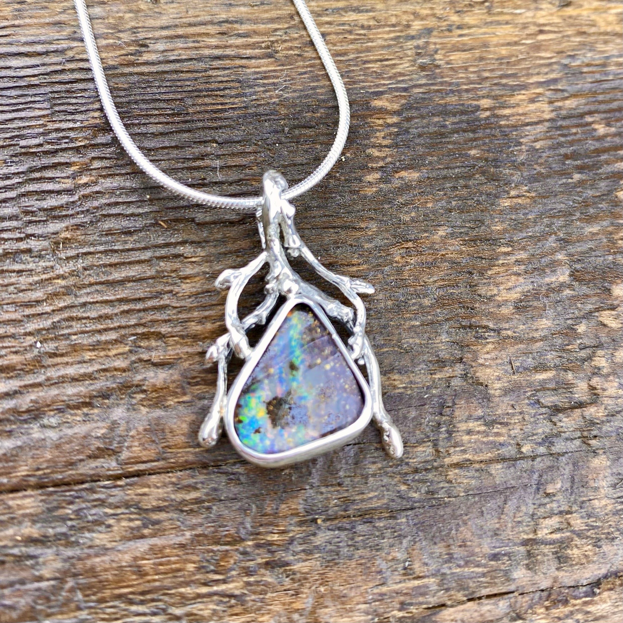 Hand forged in Sterling. This colourful opal set amongst dancing woodland flow is filled with all colours and vibrant tones~ This piece is Handcrafted with Precision and love with sterling and fine silver.