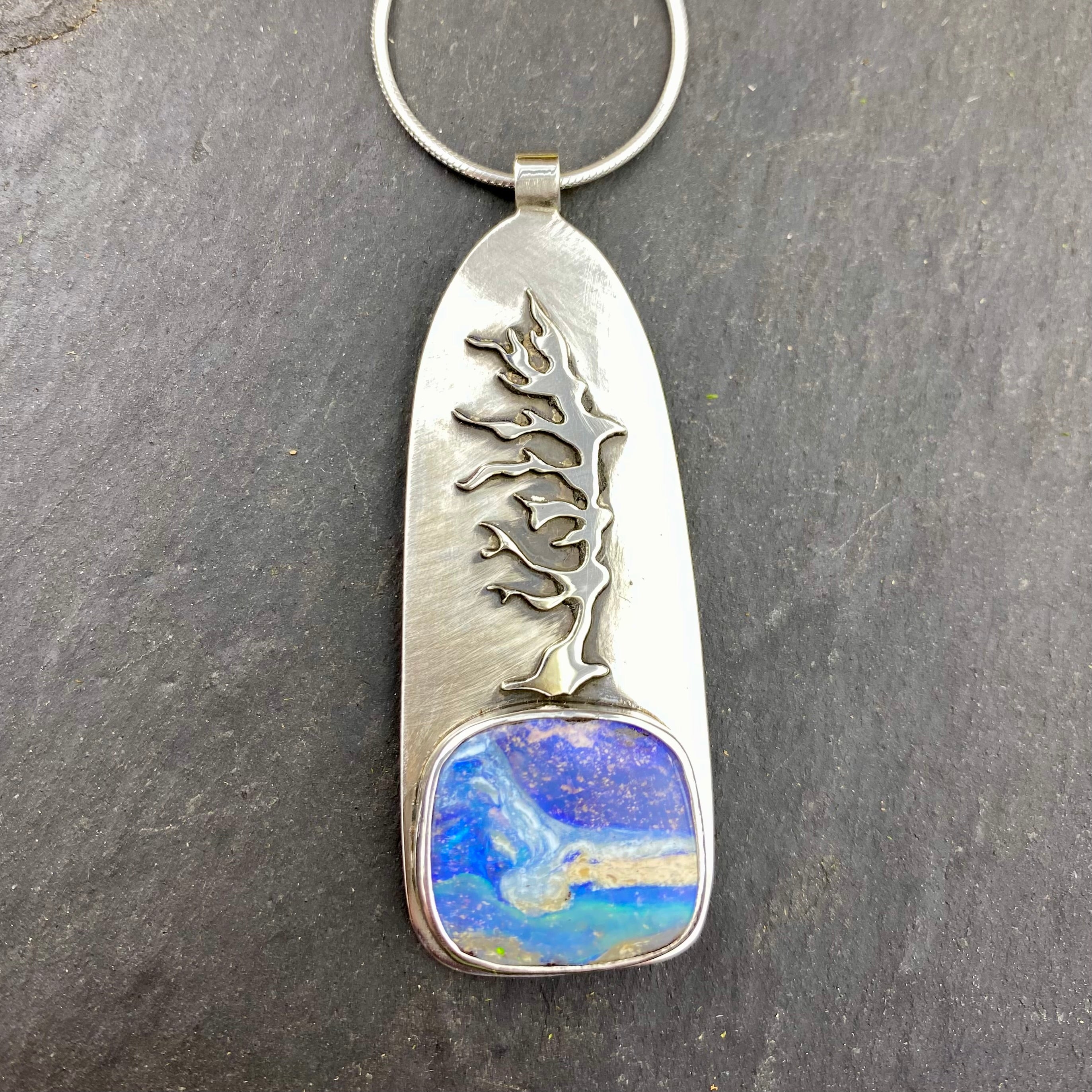 Hand forged in Sterling. This vibrant opal set amongst the detailed sihouette of the Gorgeous Geirgian Bay Windswept Pine. The stone is filled with all colours and vibrant tones~ This piece is Handcrafted with Precision and love with sterling and fine silver.