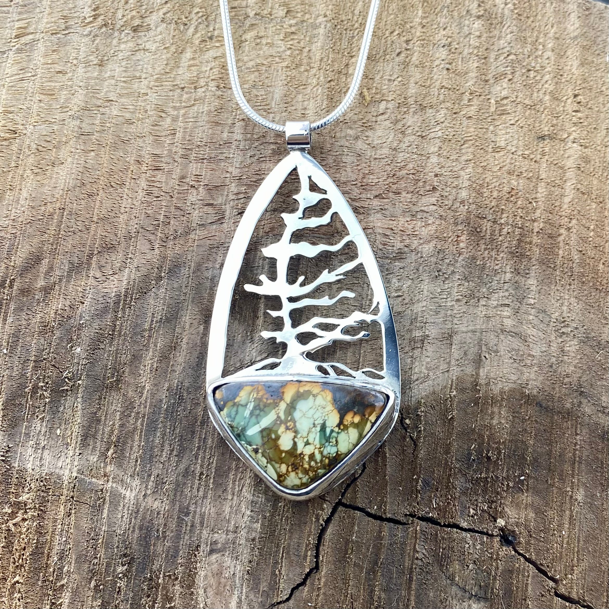 This gorgeous one a kind piece features such a Lovely silhouette of the famous Georgian windswept pine. Rooted with a lovely natural piece of Hubei Turquoise…. Ground yourself with this gorgeous piece of wearable art.